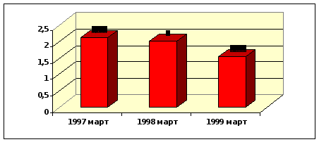 По сравнению с первым кварталом 1998г. минимальный потребительский набор подорожал почти вдвое. И, хотя денежные доходы населения увеличились в марте 1999г. на 54,1% по сравнению с тем же периодом 1998г, инфляционный скачок полностью «ликвидировал» эту прибавку. Таким образом, сейчас в среднем по РФ месячные доходы населения лишь в 1,5 раза превышают прожиточный минимум. (См. рис.3).