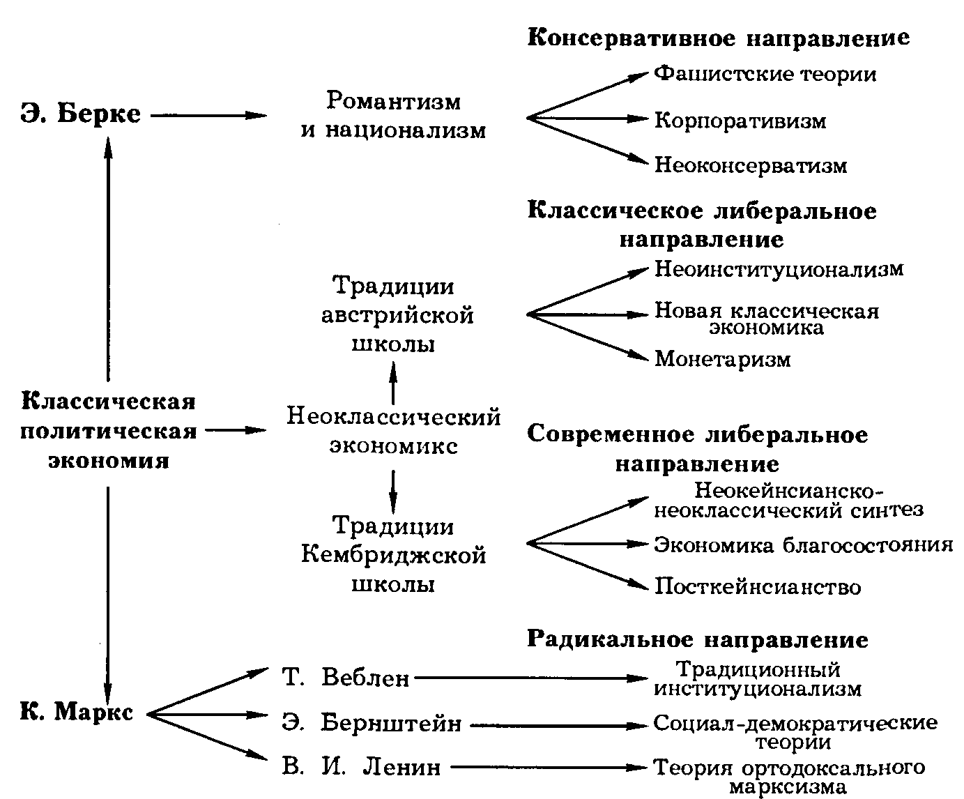 Классификация современных экономических теорий. Палитру современных подходов хорошо отражает классификация, предложенная Б. Кларком (см. рис. 1.2). Она позволяет не только отразить многообразие современных подходов, но и отметить точки их соприкосновения и взаимного перехода: от консервативного направления — через классический и современный либерализм — к радикальным течениям.
