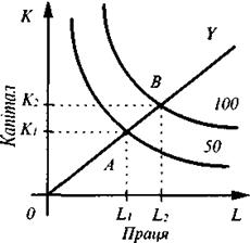 Перехід до більших обсягів продукту (від АА до ВВ) можливий, як показано на графіку, або шляхом зростання залученої праці (від L1 до L2 ), коли ми маємо комбінацію факторів L2 K1 , або шляхом збільшення обох факторів, коли маємо їх комбінацію L3 K2 .