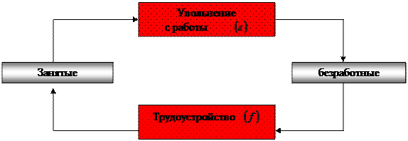 В каждый определённый период времени часть занятого населения s теряет свои рабочие места, а часть безработных f находит. Показатели трудоустройства и увольнения с работы определяют уровни безработицы.