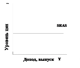 Краткосрочная кривая совокупного предложения . В данном случае принято экстремальные допущения о неизменности всех без исключения цен. Поэтому краткосрочная кривая совокупного предложения(SRAS) горизонтальна.