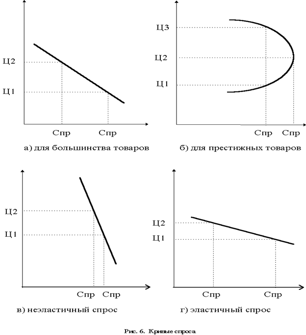 Большинство кривых спроса стремится вниз по прямой или изогнутой линии, как на рисунке 3а. Однако в случаях с престижными товарами кривая спроса иногда имеет положительный наклон типа представленного на рисунке 3б. Потребители посчитали более высокую цену показателем более высокого качества или большей желательности товара. Однако при слишком высокой цене (Ц3) уровень спроса оказывается ниже, чем при цене Ц2.