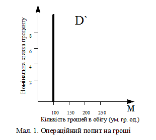 Попит на гроші як засіб обігу визначається рівнем грошового чи номiнального ВНП (прямо пропорційно). Чим більше прибуток в суспільстві, чим більше укладається угод, чим вище рівень цін, тим більше буде потрібно грошей для укладення економічних угод в рамках національної економіки. З певним спрощенням можна сказати, що операційний попит на гроші не залежить від ставки проценту, при цьому графік попиту має вигляд як на мал.1.