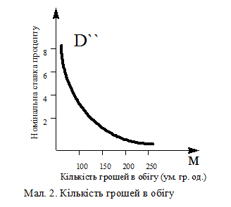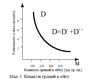 На мал. 3: номiнальна процентна ставка - на вертикальній осі, загальний попит на гроші - на горизонтальній осі. Функціональна залежність цих параметрів дає сукупність кривих, кожна з яких відповідає певному рівню номiнального ВНП. Переміщення уздовж кривої показують зміни процентної ставки. Причому спостержемо, що при високих процентних ставках крива стає майже вертикальною, оскільки всі заощадження укладаються в цій ситуації в цінні папери, попит на гроші обмежується операційним попитом і вже не знижується при подальшому зростанні проценту.