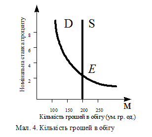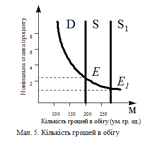В цілому грошовий ринок може бути представлений в вигляді графіку (мал 4). S - пропозиція грошей - представлено у вигляді вертикальної прямої, оскільки припускає, що грошово-кредитні і фінансові заклади створили певну кількість грошей, що не залежить від величини номiнальної ставки проценту. Крапка Е - знаходиться на перетині кривих попиту і пропозиції грошей і визначає «ціну» рівноваги на грошовому ринку.