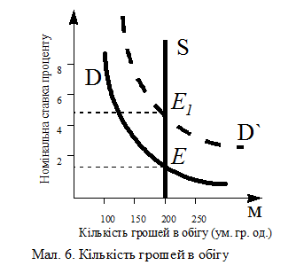 Мал. 6 iлюструє наступні реальні процеси. Хай попит на гроші зріс внаслідок зростання номiнального ВНП, тобто населення і фірми хочуть держати більше активів у вигляді готовиз грошей і чекових вкладів, продавая для цього інші авуари (наприклад, облігації). Але при незмінній пропозиції грошей рівновага на грошовому ринку може бути установлена тільки при зростанні "ціни" грошей, чи номiнальної ставки проценту.