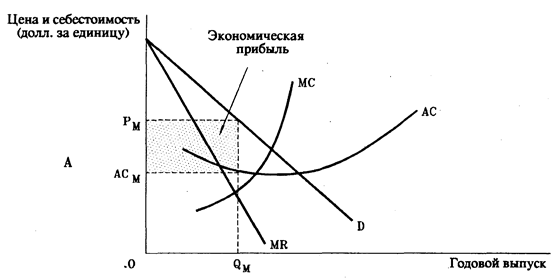 При этой цене и величине выпуска монополист получает на единицу товара прибыль (Рм - АСм). Общий выпуск равен Qm.Общая экономическая прибыль равна, следовательно, (Рм -АСм)Qм.