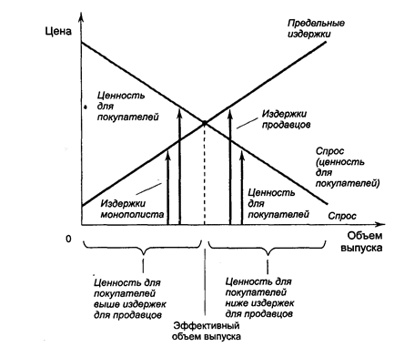 Неэффективность монополии рассматривают и в терминах цены монополиста. Так как рыночная кривая спроса выражает обратную зависимость между ценой и объемом предложения товара, объему производства ниже общественно эффективного выпуска соответствует цена, превышающая общественно эффективную цену. Когда монополист устанавливает цену, превышающую предельные издержки, некоторые потенциальные потребители, оценивающие товар выше предельных издержек производства, но ниже цены монополиста, отказываются от его приобретения. В этом и есть существо неэффективности, ибо для таких потребителей ценность данного товара выше издержек его приобретения. Таким образом, монопольное ценообразование является в определенной степени препятствием для осуществления взаимовыгодной торговли.