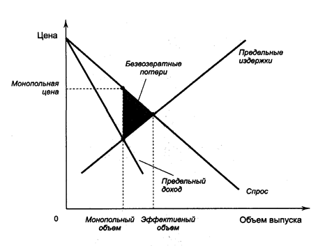 Проблема монопольного рынка связана с тем, что уровень производства продукции находится ниже значения, максимизирующего суммарный излишек. Безвозвратная потеря — мера уменьшения размеров экономического «пирога». Снижение эффективности — неизбежное следствие монопольно высокой цены: при цене выше предельных издержек уменьшается объем потребления товара. Однако прибыль, которую приносит реализуемая продукция, не создает проблем. Проблема состоит в неэффективно низком объеме производства'. Или, если взглянуть на ситуацию с другой стороны, если бы высокая цена монополии не отбивала желания у некоторых потребителей покупать данный товар, она просто увеличивала бы излишек производителя ровно настолько, насколько уменьшается излишек потребителя; общий излишек оставался бы тем же самым, как если бы монополией управлял вышеупомянутый прекраснодушный плановик.