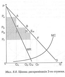 Це найпоширеніший вapiaнтцінової дискримінації, який застосовується, скажімо, на ринках авіаперевезень, на залізниці. Звичайно, і в цьому випадку монополіст отримує можливість збільшити власні прибутки.