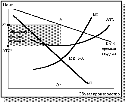 Итак, фирма выбирает объем продукции Q* (рис.3)[6] . Пусть при объеме Q* средние совокупные издержки (ATC) равняются ATC* . Прибыль фирмы в расчете на единицу продукции равняться цене P* минус издержки, или средние удельные издержки ATC* . Следовательно, фирма-монополист с лихвой покроет свои издержки, выбрав объем Q* . Общая величина ее прибыли равняется величине прибыли в расчете на единицу продукции (P* - ATC* ), умноженной на общий объем выпуска (заштрихованная площадь на рис. 3).