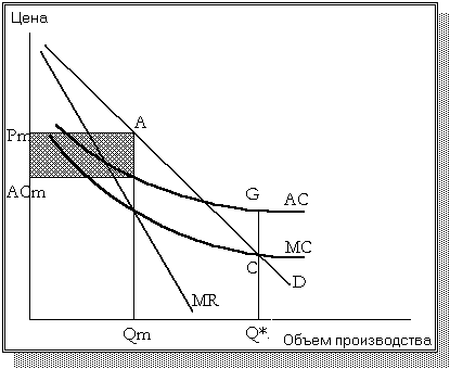 На рисунке 4 показана отрасль. В силу существования в отрасли экономии от масштаба предельные издержки всегда ниже средних издержек. Монополия производила бы выпуск Q и получала бы прибыли в размере затененной площади. Если бы цена равнялась величине предельных издержек, как в точке С, то средние издержки были бы выше цены и имел бы место убыток, равный расстоянию CG, от каждой проданной единицы блага. Точка С - точка, в которой Р = МС, не может быть точкой конкурентного равновесия, поскольку цена ниже величины средних издержек. В силу экономии от масштаба при всех объемах выпуска эта отрасль не могла бы находиться в состоянии конкурентного равновесия.