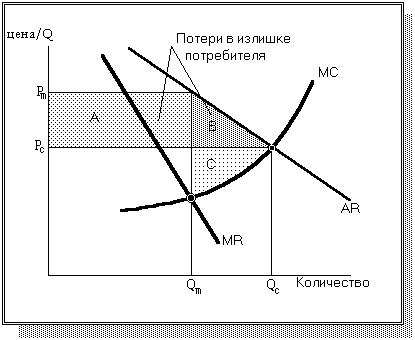 При монополии цена выше и потребители покупают меньше продукции. Из-за более высокой цены те потребители, которые покупают товар, теряют часть излишка, показанную прямоугольником А. Те потребители, которые не могут купить товар по цене Рm , но купили бы его по цене РC , также теряют излишек в размере площади треугольника В. Следовательно, совокупная потеря потребительского излишка составляет А + В. Производитель, однако, получает прибыль, обозначенную прямоугольником А, продавая товар по более высокой цене, но теряет часть излишка, обозначенную треугольником С, представляющую собой дополнительную прибыль, которую производители получают от продажи (QC - Qm ) по цене РC . Общая прибыль производителя, следовательно, составит А - С. Вычитая потерю потребительского излишка из прибыли производителя, мы получим чистые убытки, равные В + С. Это полные чистые убытки от монопольной власти. Даже если прибыли монополиста были обложены налогом и перераспределены в пользу потребителей продукта, эффективность не будет достигнута, потому что объем производства будет ниже, чем в условиях свободной конкуренции. Общие чистые убытки - это общественные издержки такой неэффективности.