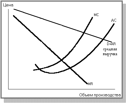 В условиях монополии, как мы уже говорили, цена не является заданной величиной, она лишь зависит от кривой спроса. Ясно, что чем больше продукции произведено, тем меньше цена реализации. Кривая спроса (D) и средней выручки (AR) имеют отрицательный наклон. Предельная выручка будет все время ниже средней. В условиях монополии кривые средней и предельной выручки не совпадают (MR<AR). Монополист максимизирует прибыль при MR=MC, но предельная выручка меньше цены в отличие от фирмы в свободной конкуренции (рис. 2).