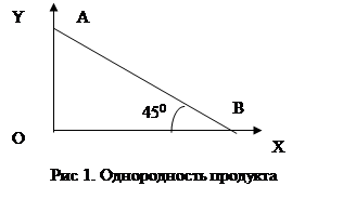 В терминах теории полезности однородность продукта означает, что продукты разных производителей полностью взаимозаменяемы для каждого покупателя, причем предельная норма замещения одного продукта другим равна единице. Например, замена в наборе апельсина одного производителя на апельсин другого производителя не изменяет полезности набора. В этом случае каждая кривая безразличия покупателя представляет собой отрезок прямой, наклоненный к осям координат под углом 450 . На рис.1 кривая безразличия для продуктов двух разных производителей обозначена через АВ. Через X обозначено количество в наборе продукта первого производителя, а через Y – второго производителя.