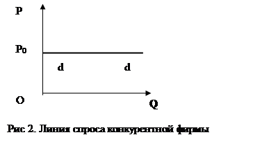 Спрос на продукт фирмы есть максимально возможный объем продаж этой фирмы (в единицах продукта) при некоторой установленной ею цене на свой продукт. Спрос на продукцию отдельной фирмы в условиях совершенной конкуренции абсолютно эластичен, кривая спроса – горизонтальная линия (рис.2).