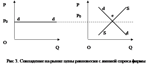 Это значит, что конкурентная фирма может продать любое количество товара по цене P0 или ниже ее. При рассмотрении графика спроса конкурентной фирмы возникает вопрос, как горизонтально расположенная линия спроса фирмы сочетается с отрицательным наклоном кривой спроса? Кривая спроса имеет отрицательный наклон, когда показываются все возможные комбинации выбора покупателя на рынке. Фирма, со своей стороны, может продать по цене равновесия любое количество единиц товара. Именно это и показывает горизонтально расположенная линия спроса фирмы (рис.3).