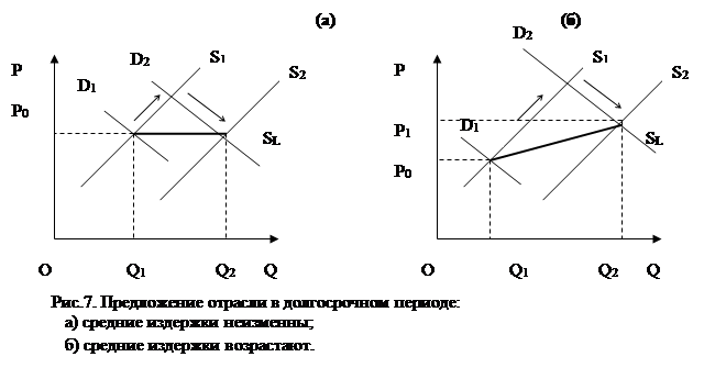 На рис.7(а) долгосрочная кривая предложения отрасли с неизменными издержками изображена жирной линией и обозначена SL . Через p0 обозначены минимальные долгосрочные средние издержки, через Q1 – отраслевой выпуск до увеличения рыночной цены, через Q2 – отраслевой выпуск после повышения рыночной цены.