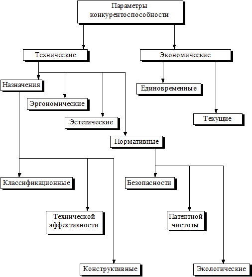 Окончательное решение по выбору номенклатуры параметров, используемых при оценке конкурентоспособности продукции, принимается экспертной комиссией с учетом конкретных условий использования этой продукции и целей оценки. Схема параметров конкурентоспособности показана на рис. 1.