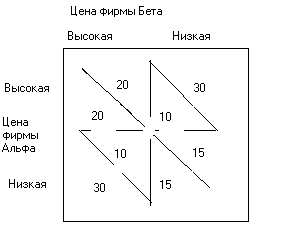 Рисунок 1 помогает понять, почему сговор является трудным делом. На нем представлена следующая ситуация. Две фирмы, «Альфа» и «Бета», являются единственными продавцами на рынке. Каждая может установить или высокую, или низкую цену. Если обе фирмы устанавливают высокую, монопольную цену, то каждая получит сверхприбыль в размере 20 млн. долл., тогда как если обе устанавливают низкие цены, прибыли каждой составят только 15 млн. долл. Таким образом, в данной ситуации имеется побудительный мотив к сговору, но также и стремление к обману соперника. Если одна фирма устанавливает высокую цену, а другая — низкую, то фирма, имеющая низкую цену, получает 30 млн. долл., а фирма, имеющая высокую цену, получает только 10 млн. долл.