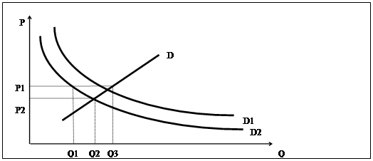 Количество блага должно было бы сократиться с Q1 до Q2, но спрос возрос с Q1 до Q3.