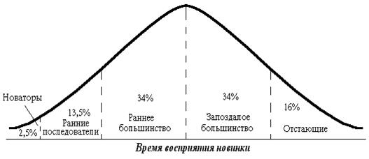 Другие люди воспринимают новинки гораздо позже. Все это позволило квалифицировать людей по степени их восприимчивости (рисунок11). После замедленного начала новинку начинает воспринимать все больше людей. Со временем их число достигает пикового значения, а затем процент начинает уменьшаться по мере уменьшения числа еще не воспринявших товар. Новаторами считаются первые 2,5 % покупателей, к ранним последователям относят следующие 13,5% и т.д.