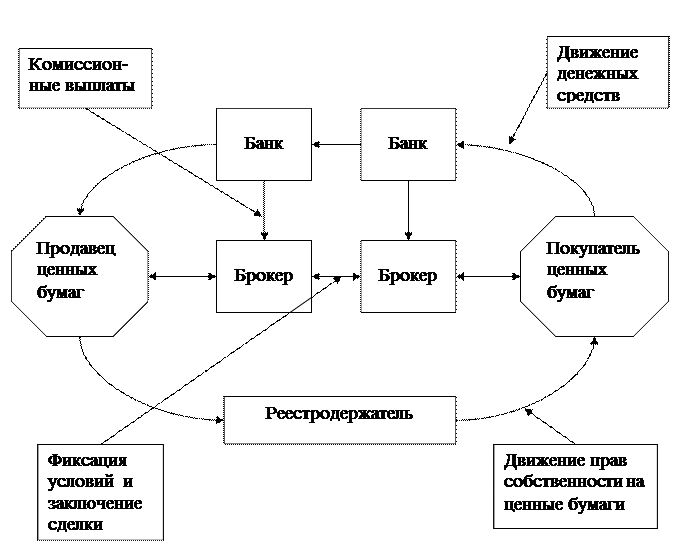 В сделках принимают участие дилеры, приобретающие ценные бумаги за свой счет и брокеры, выполняющие заказы своих клиентов. Учет взаимных обязательств участников торгов выполняют клиринговые операции. Перечисление денежных средств от покупателя продавцу осуществляют коммерческие банки, а ценные бумаги – депозитарий. Фиксация прав собственности покупателей на ценные бумаги осуществляется реестродержателями.