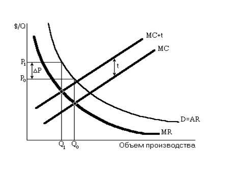 На графике мы смещаем кривую предельных издержек вверх на величину t и обнаруживаем новую точку пересечения с кривой предельного дохода (рис.3). Здесь Q0 и Р0 - соответственно объем производства и цена до обложения налогом, а Q1 и Р1 - объем выпуска и цена после введения налога.