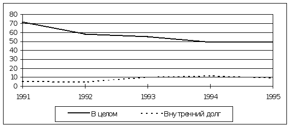 В последние 3-4 года были проведены крупные операции, оказавшие сильное влияние на уровень и структуру долга. Снижение внешнего долга, произошедшее в 1994г., было компенсировано новыми займами. По этой причине внешний долг продолжает оказывать стагнирующий эффект из-за отвлечения внутренних ресурсов на его обслуживание. Это ведет к серьезному ухудшению инвестиционного климата в стране.