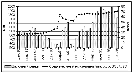Несмотря на то, что в 1995г. БНБ накапливал резервы с оглядкой на обслуживание внешнего долга, немалая доля этого резерва была предназначена для поддержания своей политики на валютном рынке. Это особенно заметно в конце года, когда БНБ был вынужден активно реализовывать твердую валюту, чтобы не допустить резкого обесценивания лева (см.рис.1-3).