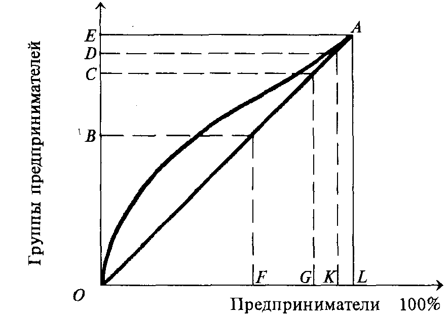На рис. 1.2 показана структура предпринимателей как социальной группы общества с рыночной экономикой. По оси абсцисс — все 100% предпринимателей. По оси ординат — соответственно выделенные выше в тексте четыре социальные группы предпринимателей по степени нарастания предпринимательских качеств. Биссектриса ОА отражает прямую пропорциональность между численностью групп предпринимателей и предпринимательскими качествами социальных групп по мере приближения к качествам четвертой, высшей группы. Линия ОА совершенно нереальна, так как у самой большой по численности группы самые низкие предпринимательские качества, о которых шла речь выше. Из графика следует, что первая группа предпринимателей (0В) обладает наибольшей численностью, что в полной мере соответствует реальности развитых стран. Наименьшей численностью обладают третья и четвертая группы. Конечно, в каждой стране своя специфика кривой, на что, в первую очередь, влияет степень развития в данной стране рыночной системы.