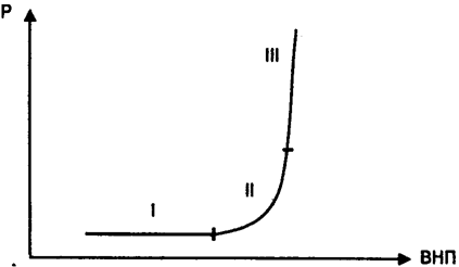 На первом отрезке общие расходы, то есть сумма потребления, инвестиций, правительственных расходов и чистого экспорта, до такой степени низки, что объем национального продукта сильно отстает от своего максимального уровня при полной занятости. Другими словами, существует значительное отставание реального объема ВНП. Уровень безработицы высок, а большая доля производственных мощностей предприятий бездействует. Теперь предположим, что совокупный спрос повысится. Тогда объем производства увеличится, уровень безработицы снизится, а уровень цен возрастет незначительно или вовсе не изменится. Это объясняется тем, что существует огромное количество бездействующих трудовых и материальных ресурсов, которые можно ввести в действие при существующих на них ценах. Безработный не просит увеличить зарплату, когда нанимается на работу. Анализируя спрос и предложение, мы установили, что повышение цен не влияет на увеличение спроса, потому что предложение представляет собой горизонтальную линию. Увеличение трудовых и других ресурсов возможно потому, что имеются бездействующие ресурсы, и дополнительное производство приносит выгоду. В результате существенно увеличивается объем продукции, а цены не повышаются.