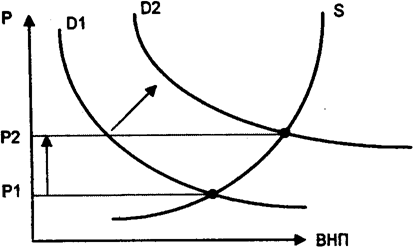Допустим, что экономика близка к полной занятости и загруженности производственных мощностей. Рост расходов населения, предприятий, государства на потре бление смещает кривую совокупного спроса вверх, растут цены (рис. 2).