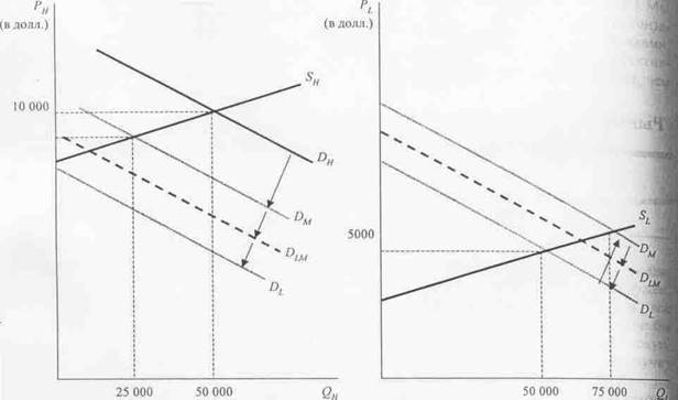 Предположим, что имеются два типа подержанных машин — высокого и низкого качества. Предположим также, что как продавцы, так и покупатели могут определить тип автомобиля. На рис. 1,а SH — кривая предложения высококачественных машин, aDH — кривая спроса на них. Аналогично, SL и DL на рис. 1,б — кривые предложения и спроса для низкокачественных автомобилей. Заметим, что S H , лежит выше, чем SL , поскольку собственники высококачественных автомобилей расстаются с ними менее охотно и должны получить при этом более высокую цену. Аналогично, DH расположена выше DL , так как покупатели готовы заплатить больше за хорошее качество. Как видно из рисунка, рыночная цена высококачественных машин — 10 000 долл., низкокачественных — 5000 долл., и при этом продаются 50 000 экземпляров каждого типа.