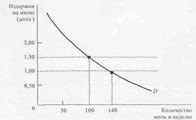 Эта проблема стоит не только перед страховыми компаниями. Моральный риск отражается и на способности рынков эффективно распределять ресурсы. Пусть, например, кривая D на рис.3 показывает спрос на автомобильные перевозки, выраженный в милях в неделю. Кривая спроса убывает, поскольку многие потребители переключаются на альтернативные средства передвижения с ростом цен перевозок автомобилями. Предположим сначала, что издержки перевозок включают стоимость страховки и что страховые компании могут точно измерить, сколько миль проехал водитель. В таком случае моральный риск отсутствует. Водители знают, что страховой взнос на длинные перевозки будет увеличен и, следовательно, вырастут общие издержки перевозок (издержки на милю пути считаются постоянными). К примеру, если издержки перевозок равны 1,50 долл. на милю (из которых 50 центов приходится на страховку), то водитель решает наездить 100 миль в неделю.