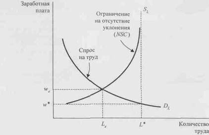 Рисунок. 4 иллюстрирует явление уклонения от работы на рынке труда. Спрос на труд DL , как правило, убывающая функция по обычным причинам. Если бы не было уклонения, то точка пересечения DL с кривой предложения труда SL показывала бы рыночную заработную плату w* и полную занятость L*. Однако, учитывая уклонение, фирмы не согласны платить w*. Им выгоднее при любом уровне безработицы назначить несколько более высокую оплату, с тем чтобы работники стали эффективнее трудиться. Этот уровень оплаты выражен кривой, построенной с ограничением на отсутствие уклонений ( NSC). Эта кривая показывает, какова минимальная величина заработной платы, при которой работники перестают уклоняться от работы, при каждом уровне безработицы. Заметим, что, чем выше уровень безработицы, тем меньше разница между эффективной заработной платой и w*. Это объясняется тем, что при высоком уровне безработицы лица, уклоняющиеся от выполнения своих обязанностей, рискуют долго не найти работу и поэтому не требуют большого вознаграждения за высокопроизводительный труд.