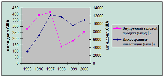 Из таблицы видно, что максимального объема в долларовом выражении инвестиции достигли в 1997г., после чего произошел спад, связанный с кризисом 1998г. В 1998 и 1999гг. имел место отрицательный темп прироста иностранных инвестиций по сравнению с предыдущим годом, соответственно -4,3% и -19%. Только в 2000г. объем иностранных инвестиций вновь начал увеличиваться и темп прироста стал положительным, составив 14,6%.