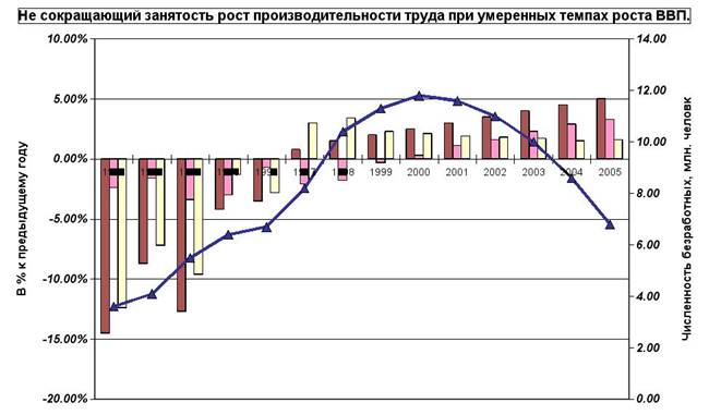 Восстановление уровня производительности 1991г. при умеренном росте ВВП.