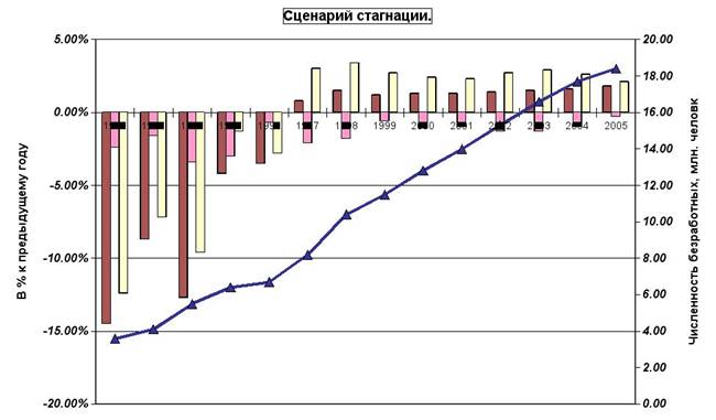 Однако Сценарии 1-3 базируются на оптимистических предположениях о начале экономического роста, сегодня же такой ход развития событий представляется все более сомнительным. Вполне вероятно, что развитие событий в российской экономике будет протекать по сценарию Стагнации, предполагающему увеличение численности безработных до 20-24% экономически активного населения, а это в свою очередь обострит многие социальные проблемы, например, увеличит уровень смертности более чем на 24%, а также приведет к увеличению почти в 2 раза количества правонарушений.