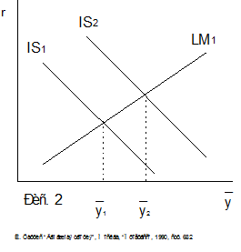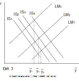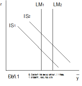 В этом случае кривая LM занимала бы вертикальное положение и фискальная политика не оказывала бы влияния на величину реального дохода[5] . Это видно на рис.1. Если LM становится вертикальной и занимает положение LМ1 то увеличение правительственных расходов, которое ведет к перемещению кривой IS из положения IS1,в IS2, не приведет к изменению равновесной величины реального дохода. Оно лишь приведет к повышению процентной ставки и снижению частного спроса на товары, что нейтрализует увеличение спроса со стороны государства. Однако увеличение денежной массы, ведущее к перемещению кривой LMв положение LM 2 , воздействует на уровень реального дохода (при условии, что уровень производства не ограничен пределом полной занятости).