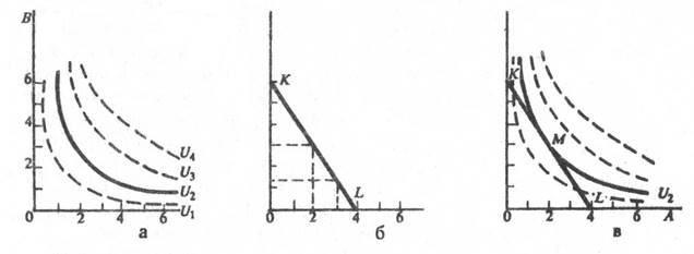 Ранее условились, что потребитель имеет фиксированный денежный доход. Пусть он тратит 6 руб. в день, причем товар А стоит 1,5 руб., а товар В – 1 руб. Ясно, что потребитель может израсходовать свои деньги на любую из возможных комбинаций товаров А и В в пределах 6 руб. На рис. 1,б прямая линия KL – это линия возможностей потребления для данного потребителя.