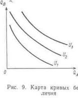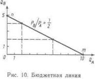 Совокупность кривых безразличия образует карту 'кривых безразличия. Чем выше кривая безразличия, тем выше благосостояние потребителя (рис. 9). В какой точке карты безразличия находится потребитель, зависит от относительных цен и его дохода. С точки удовлетворения потребности потребителю безразлично, какой набор (вдоль .кривой безразличия) он получит. Однако каждый предмет в наборе имеет разную цену. А поскольку бюджет потребителя ограничен, то и его выбор получает ограничения. Существует ряд возможных комбинаций двух товаров, которые потребитель способен оплатить из имеющегося в его распоряжении бюджета. График этих возможностей образует бюджетную линию (ряс. 10).