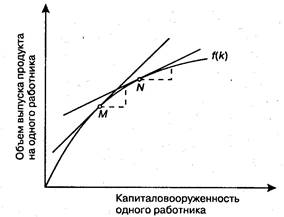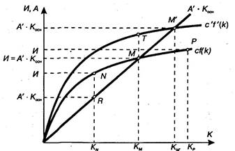 Отсюда следует, что устойчивый уровень потребления одного работника представляет собой разность между объемом выпуска и величиной выбытия капитала в устойчивом состоянии. При росте капиталовооруженности увеличивается выпуск продукта. Однако это требует все большего количества продукта для возмещения выбытия капитала. Поэтому выполнение «золотого» правила: ППК=А' Kосн , где ППК — предельный продукткапитала, по достижении максимума душевого потребления связано с равенством предельного продукта капитала и нормы амортизации (выбытия). Это значит, что необходимо найти такие точки производственной функции /(k) и функции выбытия капитала А' Kосн , в которых тангенсы их углов наклона совпали бы, т.е. касательная к кривой производственной функции и линия выбытия капитала были бы параллельны (рис. 4).