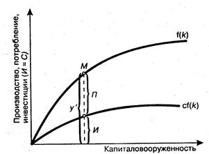 Обратившись к рис. 4, можно заметить, что капиталовооруженность, которая меньше уровня, соответствующего «золотому» правилу, вызовет увеличение запасов капитала и рост производства, превышающий наращивание выбытия капитала, а это означает рост потребления. При этом угол наклона производственной функции f(k) больше, чем угол наклона линии А' Косн и расстояние между ними увеличивается по мере возрастания капиталовооруженности. Напротив, при объеме капитала, превышающем его величину, соответствующую «золотому» правилу, дальнейший рост капиталовооруженности уменьшает потребление, так как рост выпуска продукта окажется меньше прироста выбытия капитала.