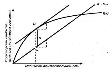 Уровень капиталовооруженности, соответствующий значению Кm , называется устойчивым и соответствует равновесию экономики в долгосрочном периоде. Призначении капиталовооруженности меньшие КM ,(например, КN ) инвестиции превышают выбытие, и запасы капитала увеличиваются. И наоборот, при значениях капиталовооруженности больше уровня КM (в частности, КP ), выбытие превышает инвестиции, и запасы капитала уменьшаются. Независимо от первоначальной величины функционирующего капитала, при которой начинает развиваться экономика, последняя затем достигает устойчивого состояния.