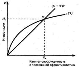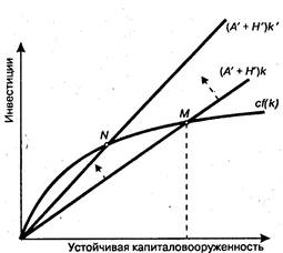Увеличение разности нормы выбытия капитала и прироста населения указывает на ускоренное сокращение капиталовооруженности труда, так как капитал распределяется на большее число занятых. Экономика находится в устойчивом положении, если капиталовооруженность остается неизменной, следовательно, дополнительные инвестиции должны поддерживать на установившемся уровне фондовооруженность вновь вовлеченных в производство работников и компенсировать выбытие капитала. Для того, чтобы экономика находилась в устойчивом положении, инвестиции должны компенсировать выбытие капитала и рост населения. На рис. 5 этому условно соответствует точка М пересечения кривой инвестиций cf ( k ) и линии выбытия капитала и роста населения (А '+ H') k.