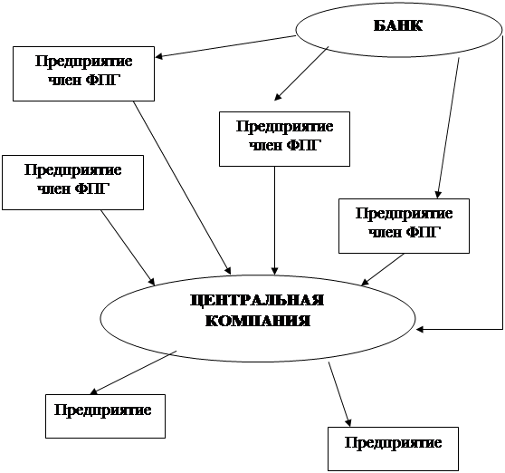 Центром «банковской» ФПГ является кредитно-финансовая организация. Стремление российских банков к сотрудничеству с промышленными предприятиями вызвано желанием диверсифицировать свою деятельность, приобрести новую клиентуру, снизить инвестиционный риск. Сегодня конкуренция банков смещается в сферу кредитования промышленности. Также акционерный контроль над промышленными компаниями позволяет банкам расширить свое влияние на рынках лизинговых, факторинговых, страховых и прочих финансовых услуг. ФПГ этого вида отличаются широким разнообразием входящих в них предприятий, которые могут быть совершенно не связаны друг с другом ни по производственной кооперации, ни по другим хозяйственным интересам. (см. прил. 1)