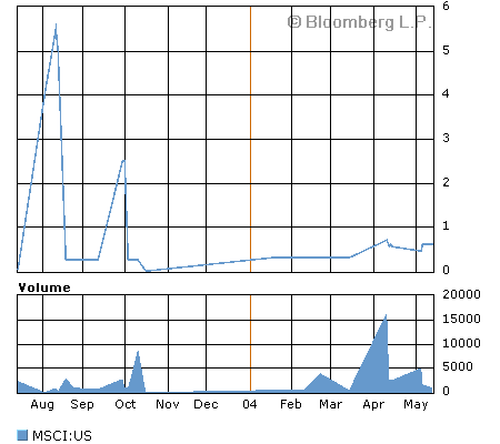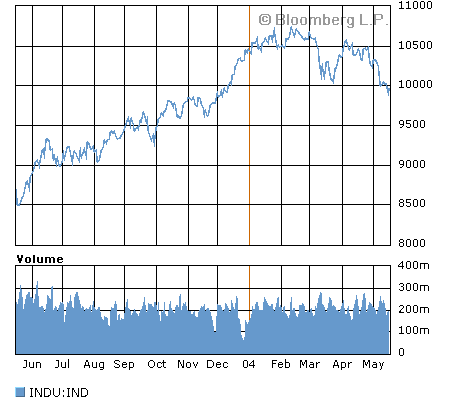 По данным The Wall Street Journal многие мировые инвесторы пересматривают свои планы в странах с развивающейся экономикой на оставшуюся часть года. Американские фонды, инвестирующие в emerging markets, зафиксировали на неделе, завершившейся 5 мая, отток средств на сумму $411 млн. За последние 8 недель отток средств из фондов, инвестирующих в развивающиеся экономики, происходил в течение 6 недель. Трейдеры также отмечают, что хеджевые фонды уже начали выводить средства из emerging markets. Доходы от инвестиций в страны с развивающейся экономикой сейчас также демонстрируют тенденцию к снижению. Индекс MSCI (рис. 1.3 [14]), рассчитываемый для emerging markets, с начала года опустился на 10% с максимального уровня в начале года. Облигации стран emerging markets резко упали в цене после того, как на рынке после публикации благоприятных данных о состоянии рынка труда в США усилились ожидания скорого повышения процентных ставок в Америке. Глобальный индекс J.P.Morgan EMBI+ Global (рис.1.4 [14]) упал на 2,1%, а средний спрэд по облигациям emerging markets вырос на 0,25 процентного пункта до 5,15 процентного пункта. На рис. 1.5 представлен индекс Доу-Джонса – он отражает состояние рынка огромных компаний («голубые фишки» - bluechips – компании с рыночной стоимостью больше 5 миллиардов долларов [13]).