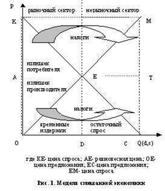 Из раздела 1.1 следует, что смешанная экономика имеет вид двухсекторной модели: видимый сектор – «рыночной» («частный», «предпринимательский»), и невидимый – «нерыночный» («общественный», «государственный»), в совокупности и представляющее двойственное (рыночно-нерыночное) строение современной экономики, приобретающей в силу этого «смешанный» характер.