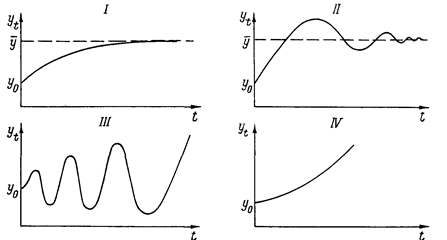 Рис. 2. Варианты динамики национального дохода при взаимодействии мультипликатора и акселератора.